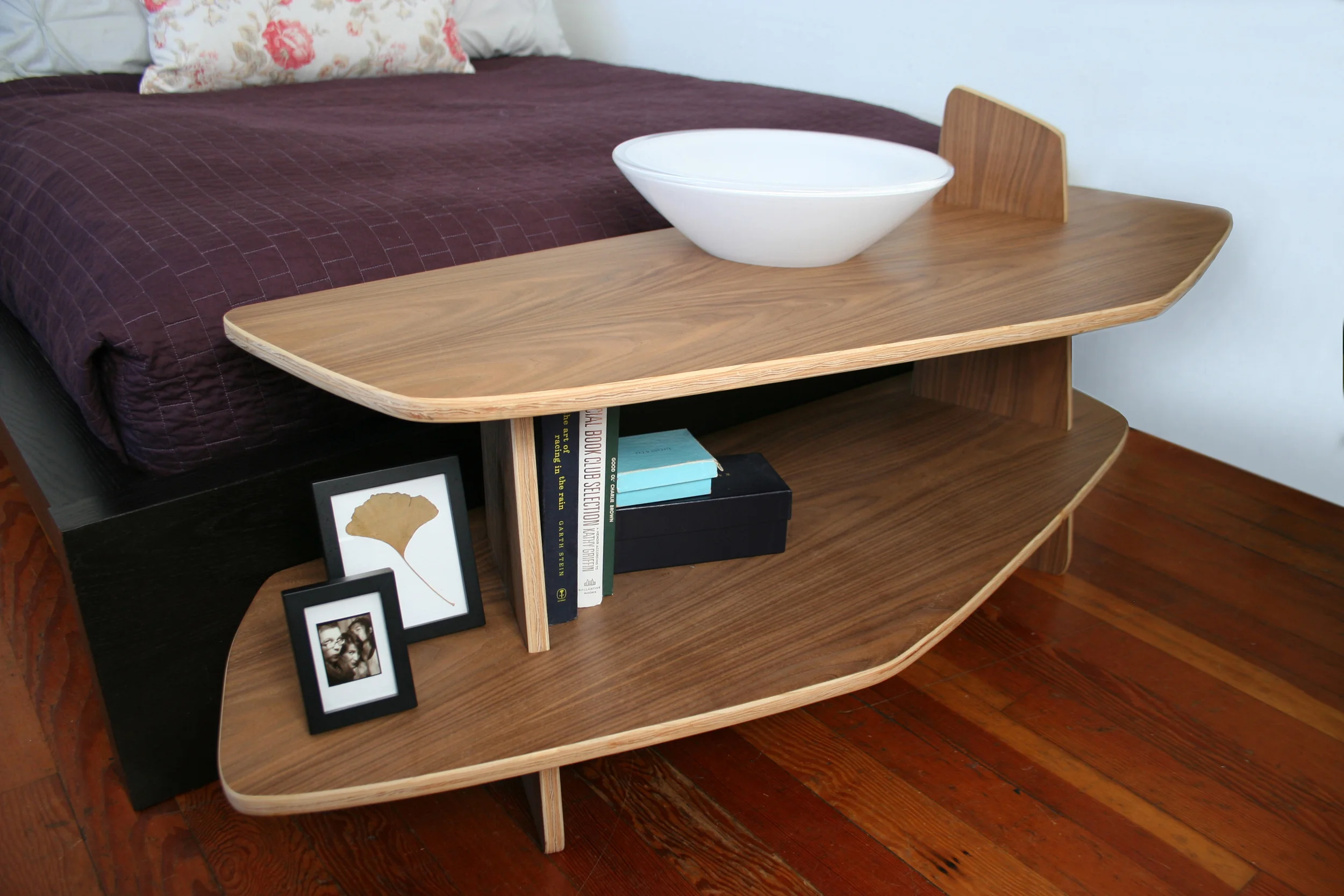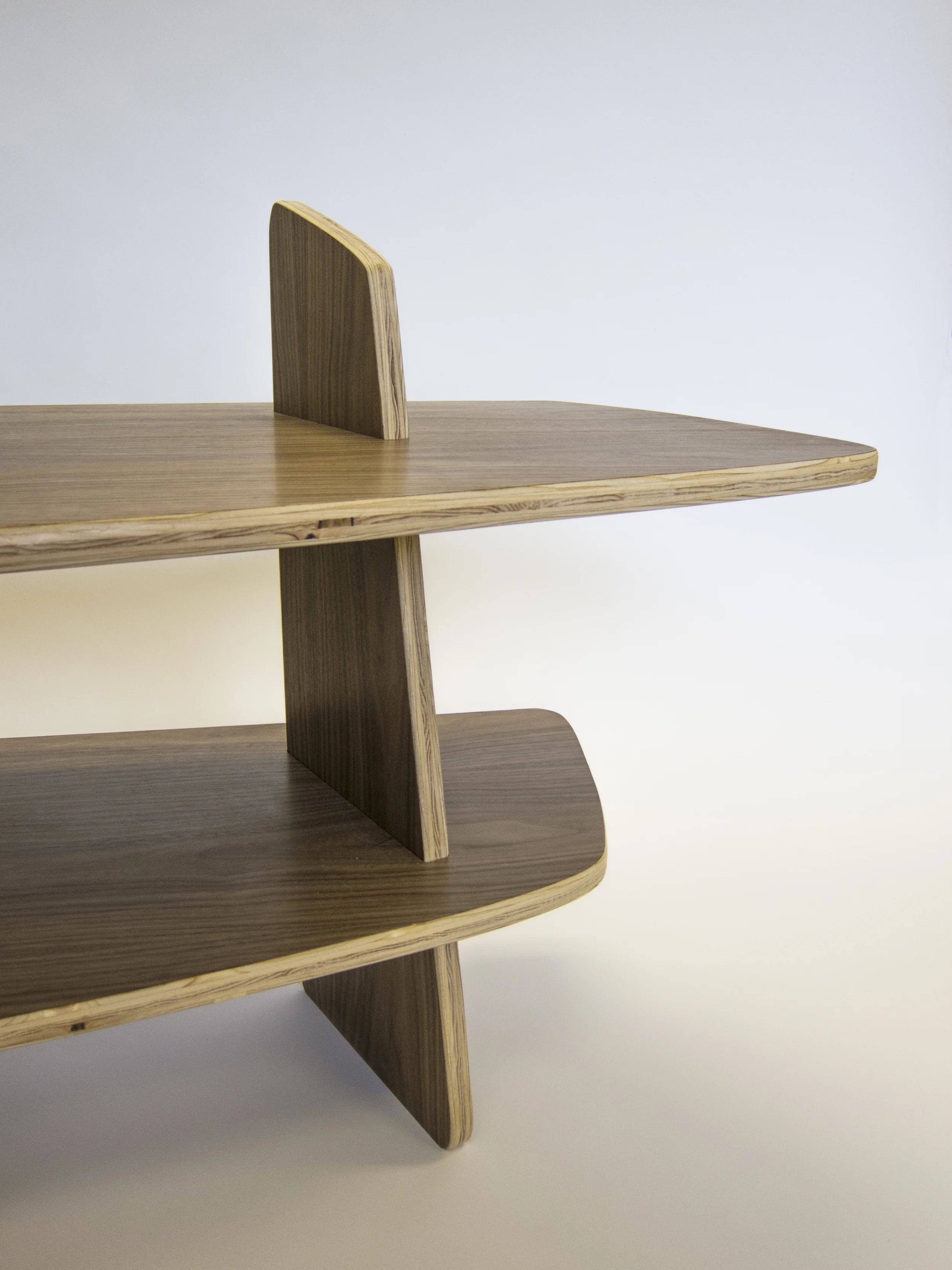 This shelf unit is carefully composed of four pieces of plywood. The legs are strategically angled to increase strength and durability, one is protruding out the top to create visual balance and a prop for books. The shelves are mirror images of one another, flipped and slightly shifted to create harmony. Keep what you want in sight and hide what you don't.